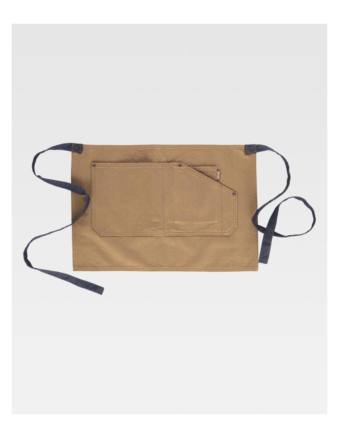 Delantal francés corto en tejido de canvas, incorporando un bolsillo central de corte asimétrico compartimiento con un bolsillo de estilo relojero en el interior, las cintas de estilo vaquero para si poder ajustar bien a la cintura, además esta delantal tiene de peculiar que es un delantal con un diseño contemporáneo.