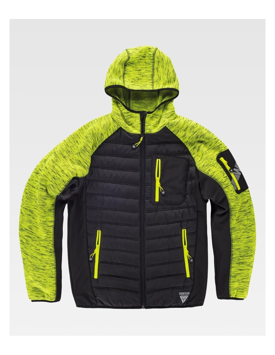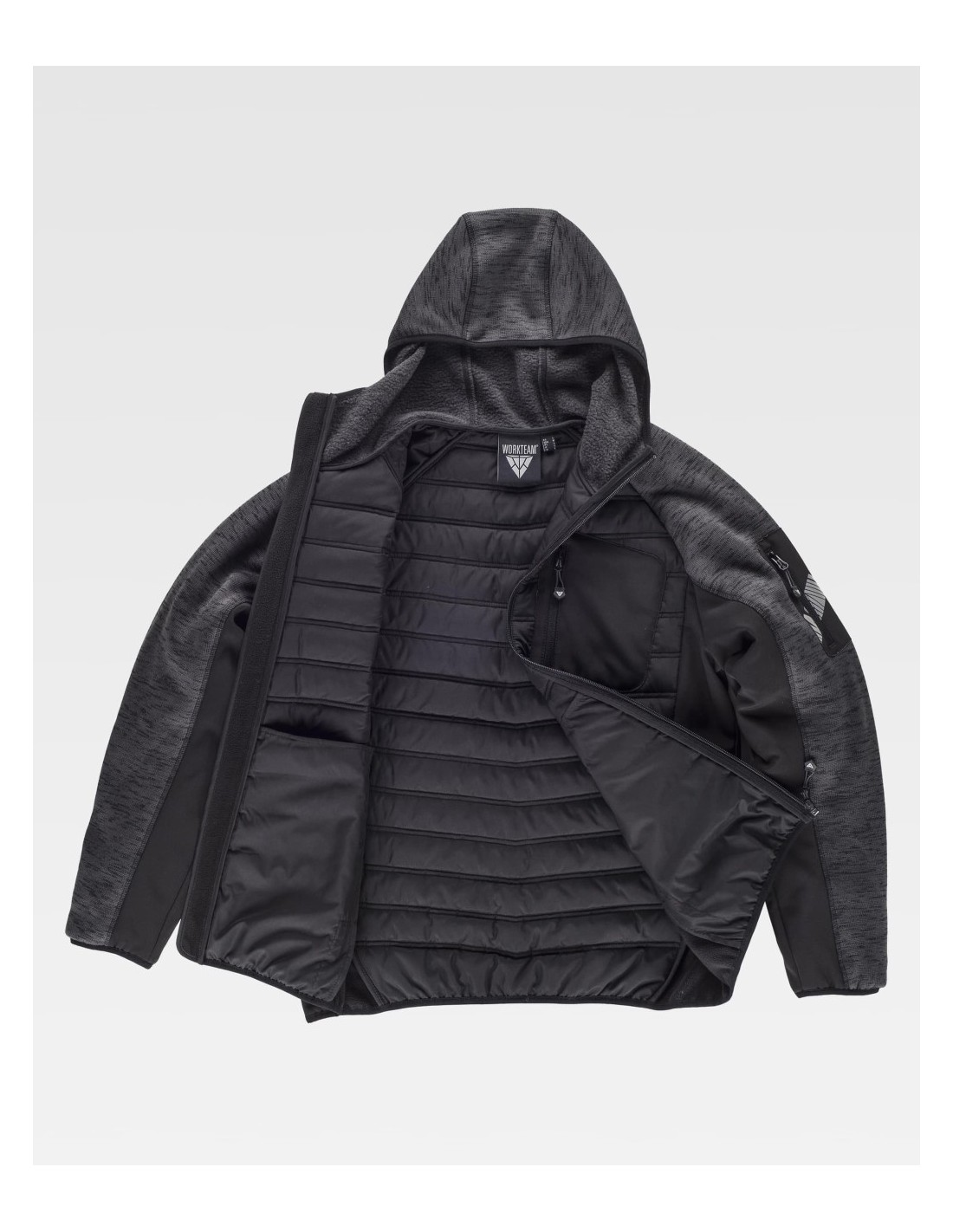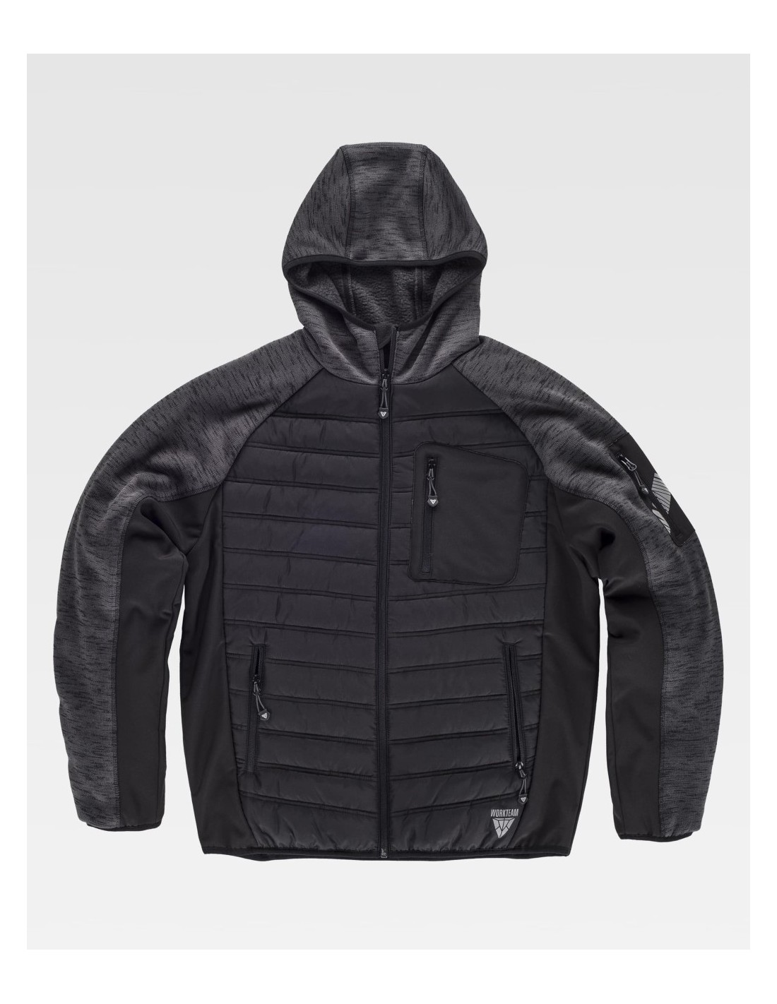 Chaqueta de Workteam con capucha, chaqueta de cuello alto con cierre de cremallera de nylon, dos bolsillos laterales interiores con un cierre de cremallera, dos bolsillos laterales con cremallera, otro bolso de plastón en el pecho de la prenda, además de la característica de tener una cinta decorativa en el brazo, capucha, puños y bajos ribeteados con bies elástico.