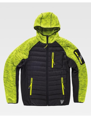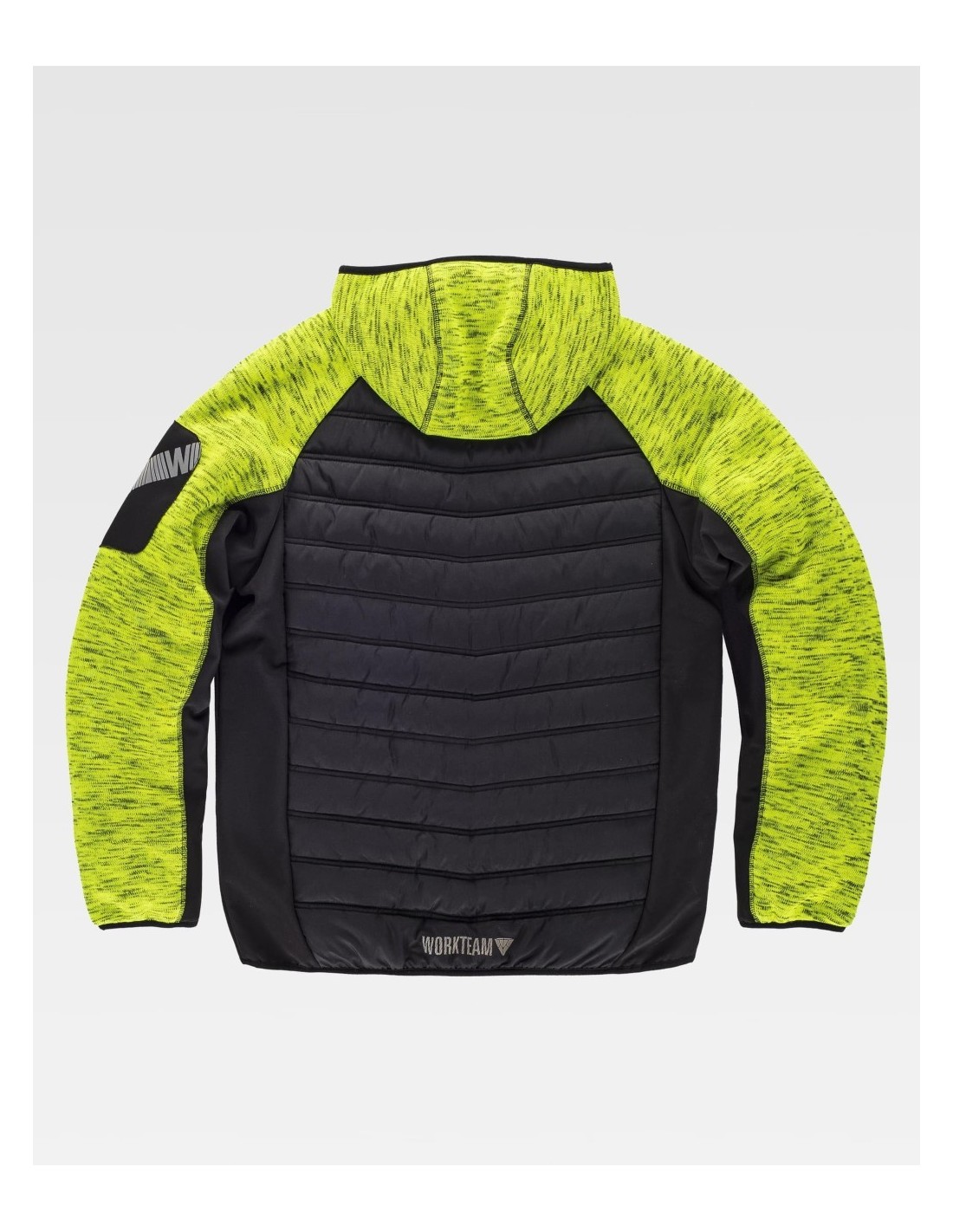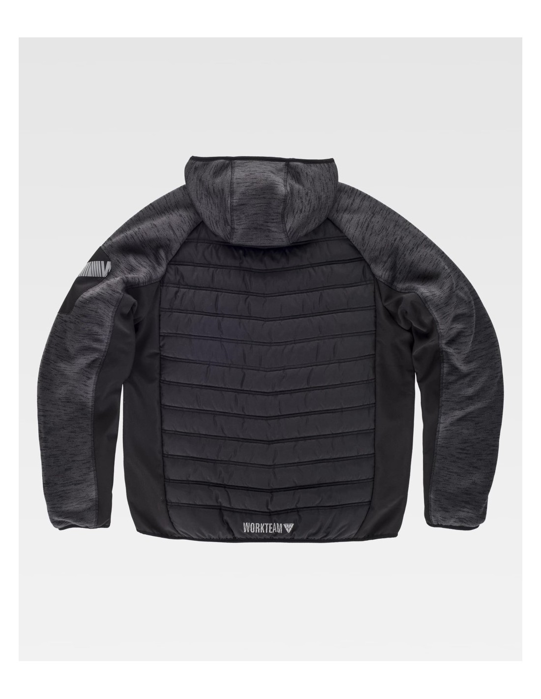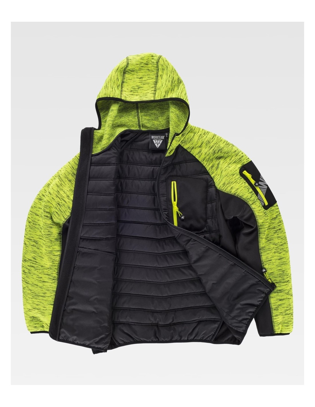 Chaqueta de Workteam con capucha, chaqueta de cuello alto con cierre de cremallera de nylon, dos bolsillos laterales interiores con un cierre de cremallera, dos bolsillos laterales con cremallera, otro bolso de plastón en el pecho de la prenda, además de la característica de tener una cinta decorativa en el brazo, capucha, puños y bajos ribeteados con bies elástico.