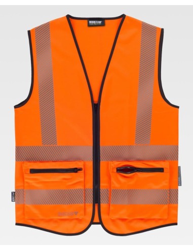 Chaleco de alta visibilidad con cintas reflectantes segmentadas de Workteam, escote a pico y cierre central de cremallera, los bolsillos se puede encontrar en los laterales con fuelle y tambien un cierre de cremallera a juego con el cierre central del chaleco, las cintas reflectantes segmentadas termoadhesiva las podemos encontrar en la zona de los hombros y otros dos en el pecho y en la espalda, ribeteado con bies a contraste del color principal ya sea amarillo o naranja.